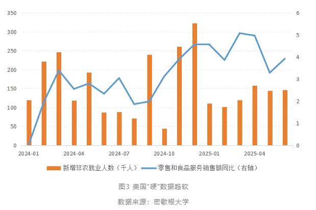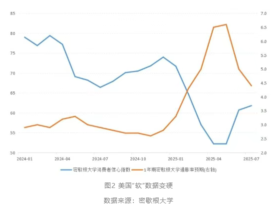 從調(diào)查類“軟”數(shù)據(jù)看,市場(chǎng)情緒出現(xiàn)明顯修復(fù)。密歇根大學(xué)消費(fèi)者信心指數(shù)在4月大幅跌至52.2的低位后,7月已反彈至61.8,擺脫了2022年8月以來的最低水平。與此同時(shí),1年期通脹預(yù)期從4月6.5%的1982年以來峰值大幅回落至7月的4.4%(圖2)。這一變化表明,市場(chǎng)對(duì)關(guān)稅政策沖擊消費(fèi)和推高通脹的極端悲觀預(yù)期正在緩解,投資者和消費(fèi)者信心逐步企穩(wěn)。